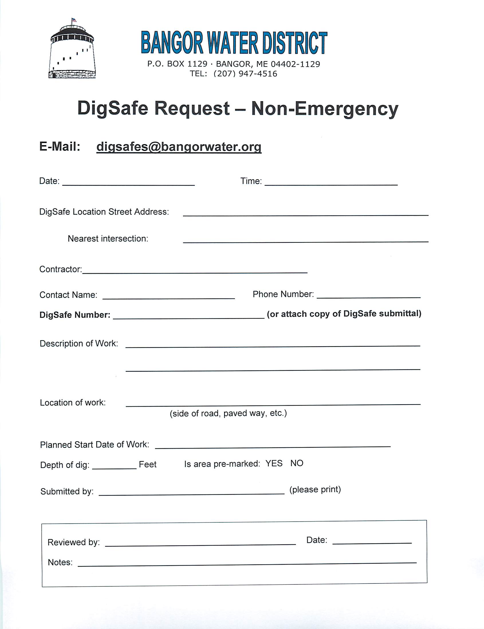 Complete the digsafe request form, and return AT LEAST THREE BUSINESS DAYS IN ADVANCE to: digsafes@bangorwater.org